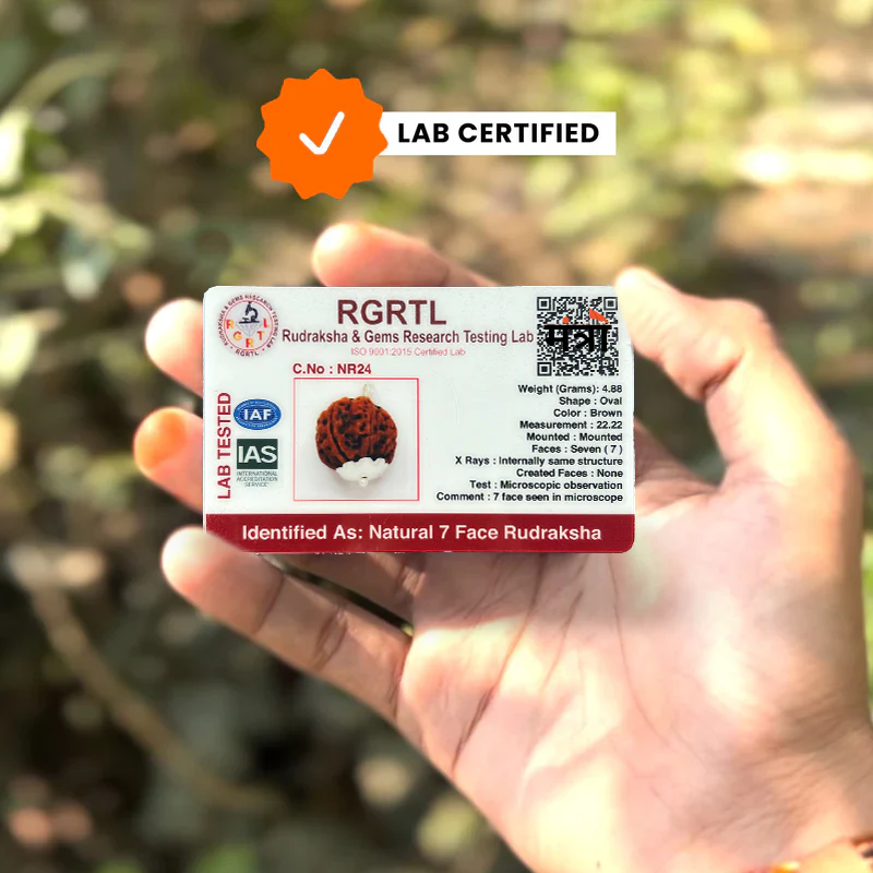 Genuine 7 Mukhi Nepali Rudraksha with certification of authenticity.